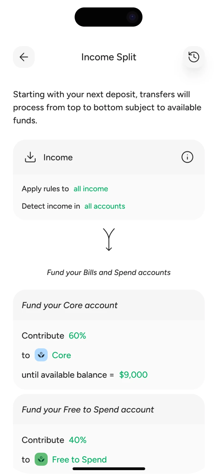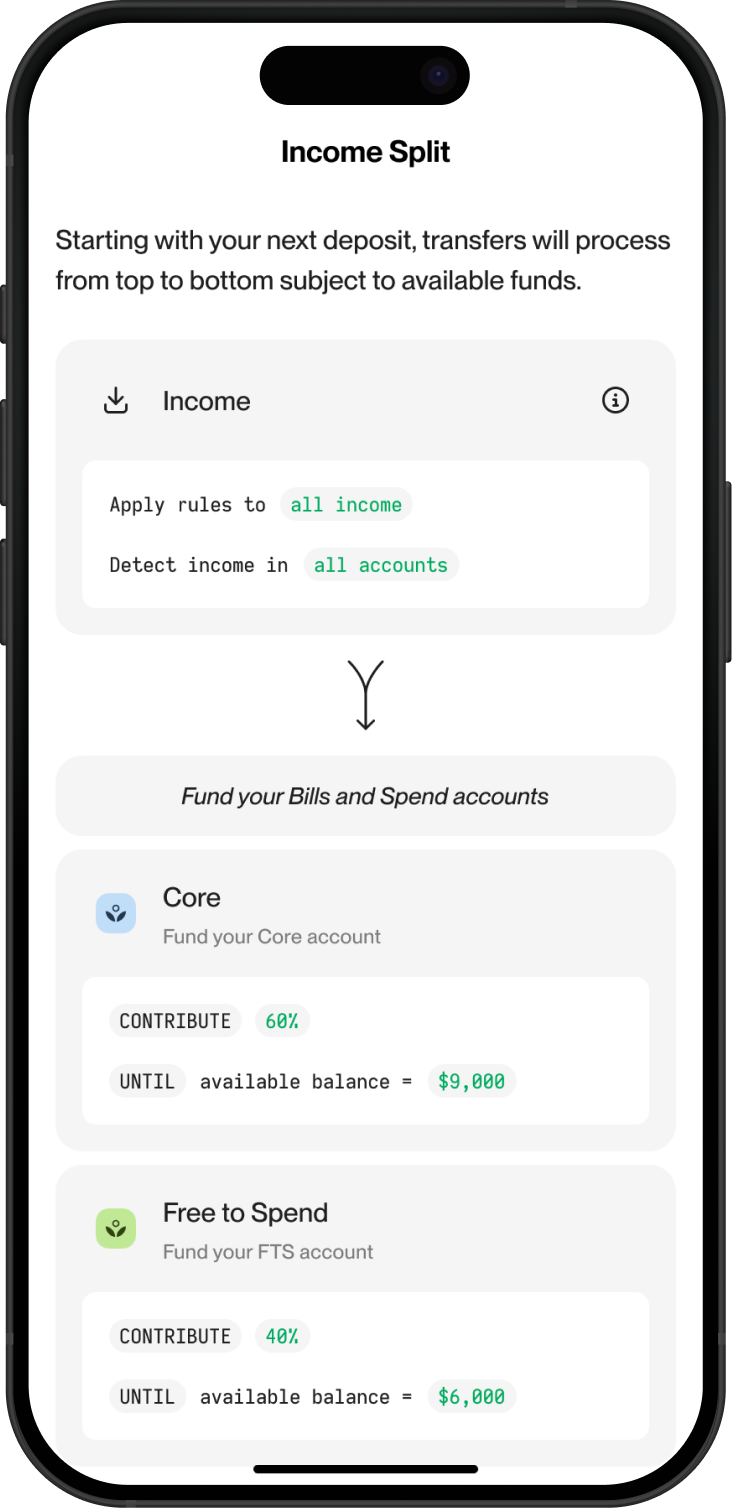 Income split seamlessly puts your plan into action, auto-routing every dollar based on your priorities. Link your income, and boom – no more wondering where your money’s going (or why). It now supports your life and moves you forward – effortlessly.